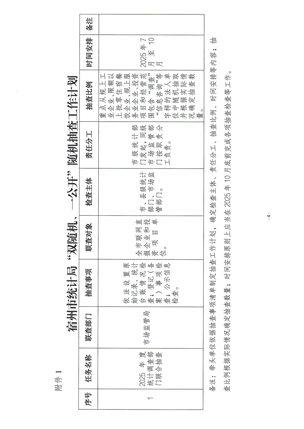 宿州市2025年度对全市联网直报企业和投资项目单位开展“双随机、一公开”部门联合抽查工作方案 |