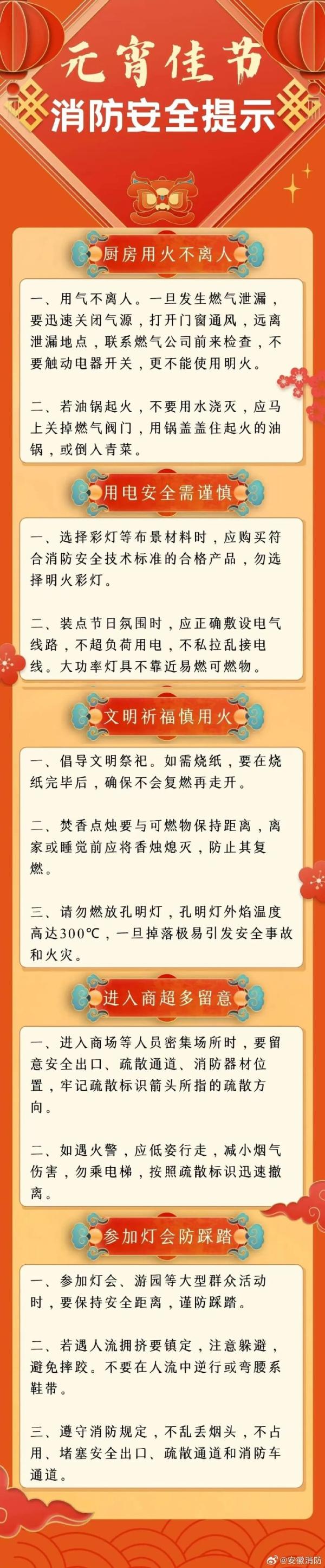 赏花灯、吃汤圆,团圆时刻勿忘安全;禁放孔明灯,合规燃放烟花,远离易燃物;居家用火用电不离人,及时关闭燃气电源;商场景区先记安全出口,遇火情沉着逃生;平安过节,快乐闹元宵!